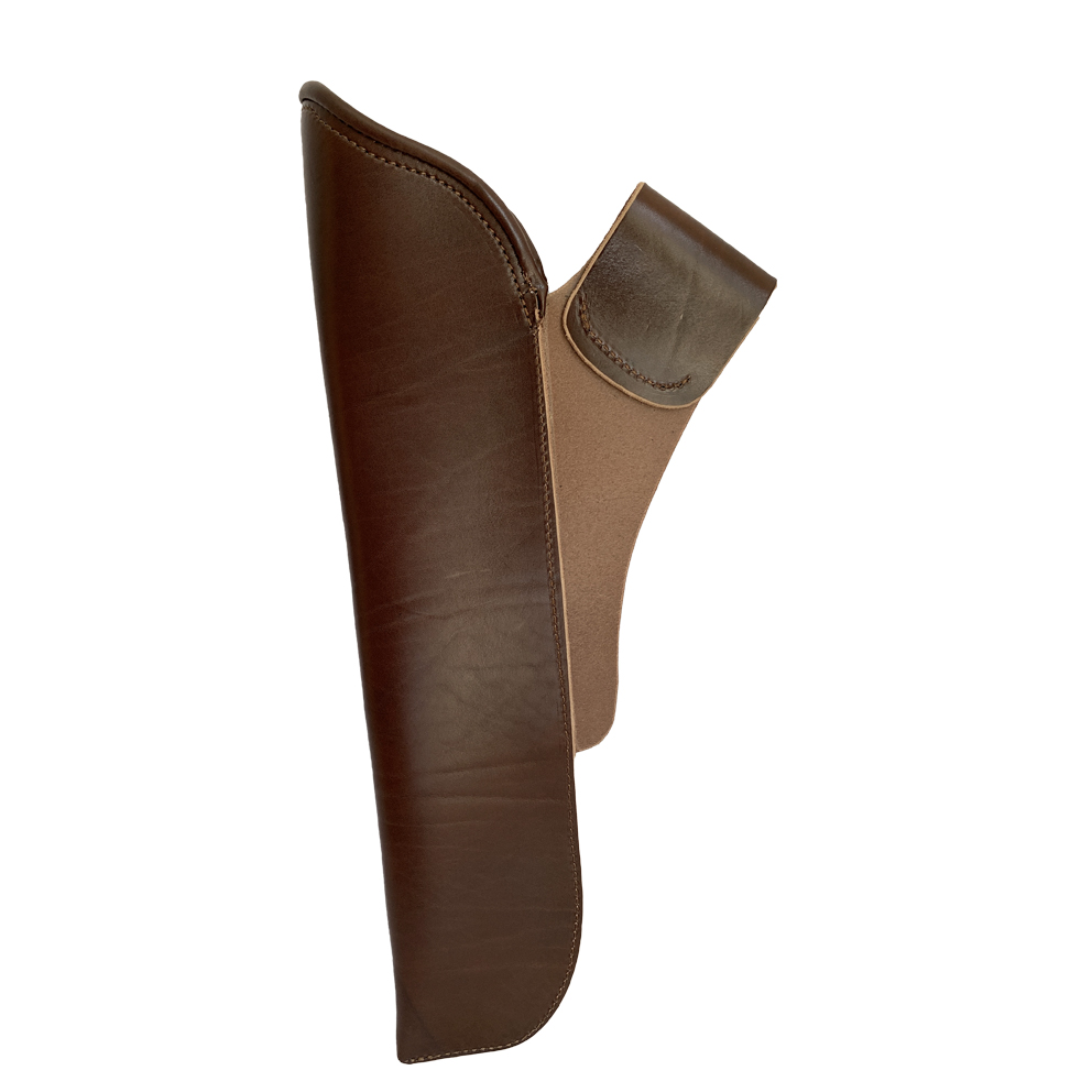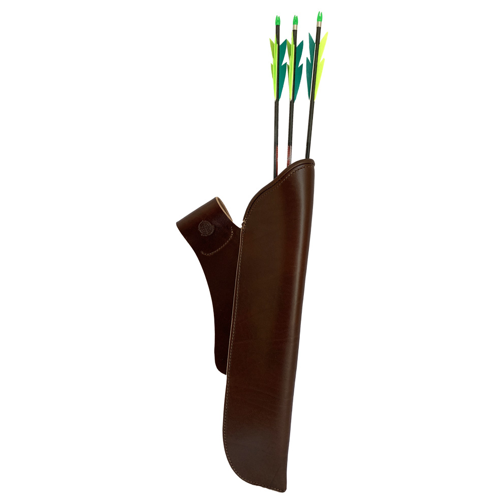 Ausgesuchtes Leder, formschön verarbeitet: Der dunkelbraune Seitenköcher von Bow-Targets bietet acht Pfeilen Platz, wobei der nach unten schmal zulaufende Köcher den Pfeilen sicheren Halt gibt.
