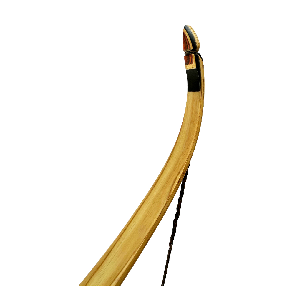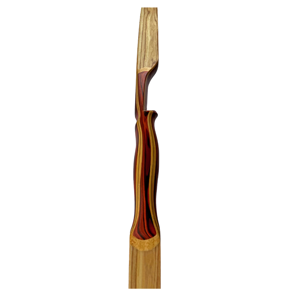 Das Griffstück ist mit einem 2mm Bambusstreifen in Form eines Halbmondes akzentuiert, das die elegante Optik unterstreicht. Zusätzlich sorgt der Bambusstreifen für mehr Stabilität. Das Griffstück ist etwas voluminöser gehalten und wird wunderschön mit einem zweifarbigen Overlay an Bauch und Rücken eingerahmt, was zugleich mehr Gewicht und dadurch eine höhere Stabilität im Schussverhalten mit sich bringt. Der Bogensattel ist nach oben hin aufsteigend und das Schussfenster gewölbt, so entsteht ein minimalistischer Berührungspunkt des Pfeils.